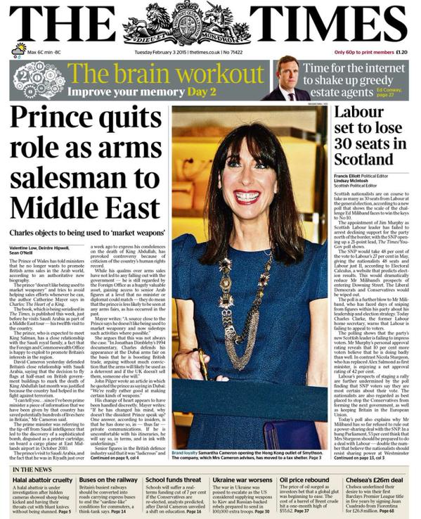 Tuesday's Times: "Prince quits role as arms salesman to Middle East" (via @suttonnick) #tomorrowspaperstoday