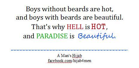 [As an aside: Both men and women are commanded by the Qur'an to maintain their modesty. And while one, generalized understanding presents the beard as a "natural disposition" for men -- separate from the requirement to cover their private parts -- there is also the opinion that the beard is an important part of a man's modest dress, or his hijab. So it's not good enough to argue away the double standard in Internet memes by saying there are differences in opinion over the beard, because the same can be said about hijab. Besides, it's not cool to comment on anyone's hijab or beard. And really not cool to pretend to know how God will Judge anyone -- especially in a cheesy Internet meme.]